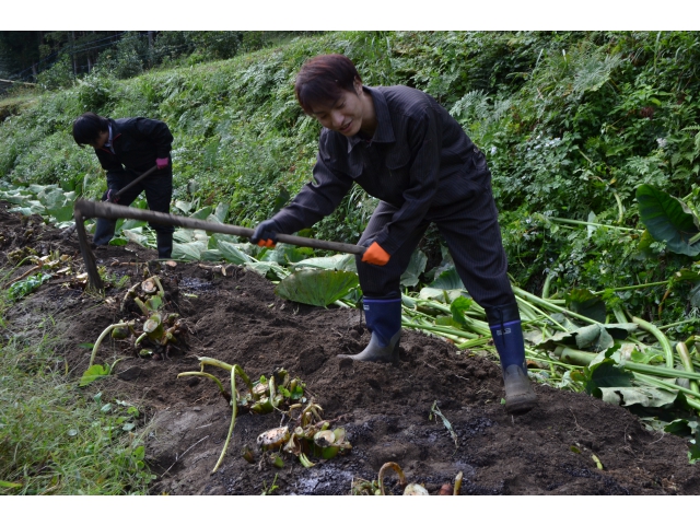 豊根村で里芋を作っていらっしゃる農家さんの畑に、若い職員総出でいも煮会で使用する里芋を堀りのお手伝いに行ってきました!!